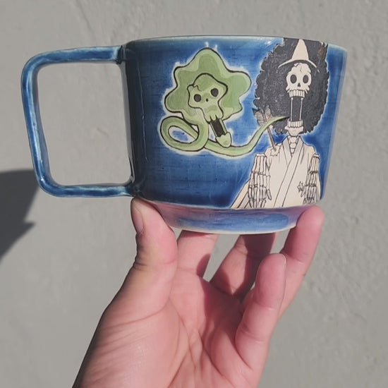 This mug is handmade on the pottery wheel, created from porcelain clay, hand painted with underglaze, and glazed to make it food and microwave safe!